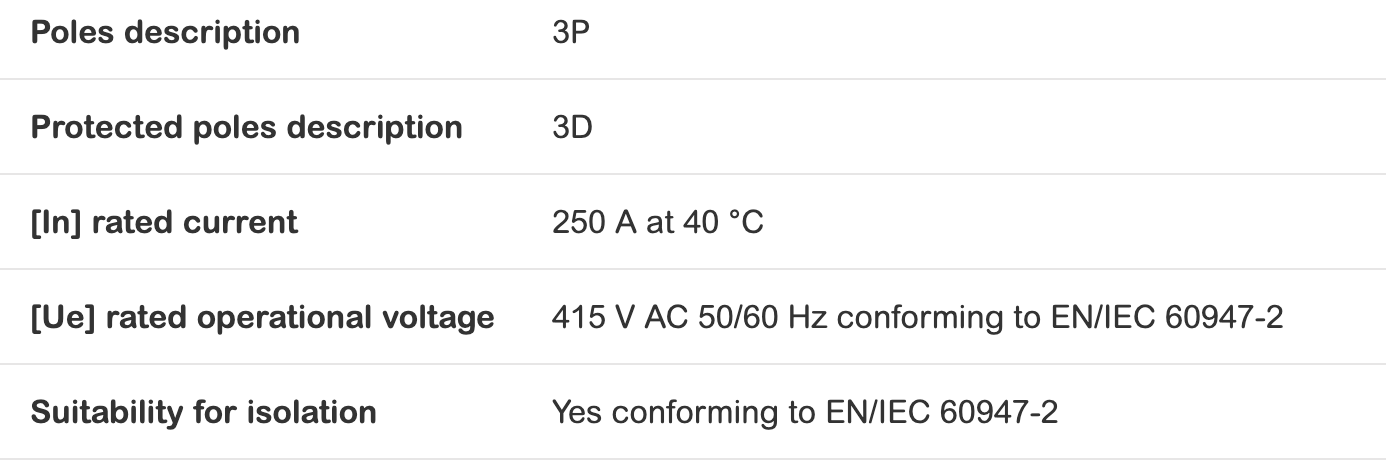 Es un interruptor de circuito completo de 3 polos hecho de un marco de interruptores de 400A y de una unidad de viaje magnético térmico (TMD). MCCB tiene una buena relación de precio para aplicaciones básicas y ofrece una protección eléctrica confiable para sus aplicaciones. La capacidad de ruptura (UCI) es 36ka RMS a 415VAC 50/60Hz. El voltaje operativo es 415VAC 50/60Hz. Este producto incorpora una unidad de viaje térmico (TMD) de calificación de 250A (in) (TMD). Esta unidad de viaje TMD proporciona una IR de protección térmica ajustable (contra sobrecargas) con un rango de ajuste de 0.7xin a 1xin (175a-2550a). Y proporciona una protección magnética fija (contra cortocircuitos) establecida a 12xin (3000A). MCCB viene con una variedad de accesorios opcionales fáciles de elegir e instalar. Las dimensiones del producto son de 120 mm (ancho) x 205 mm (altura) x 105 mm (profundidad). El peso es de 3.5 kg.
