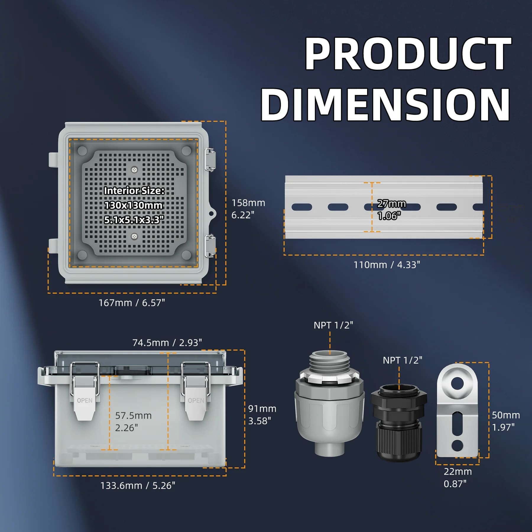 Diseñado para condiciones de exteriores difíciles, este recinto eléctrico cuenta con una clasificación IP67, lo que lo hace altamente resistente al agua y al polvo. El espacio interno mide 5.1 ″ x5.1 ″ x3.3 ″, mientras que el exterior es de 5.9 ″ x5.9 ″ x3.5 ″, ofreciendo un amplio espacio para sus proyectos de cableado. El paquete incluye dos glándulas de cable NPT1/2 ″ y un conector ajustado líquido, racionalización de la gestión de cables y mejorando la seguridad.