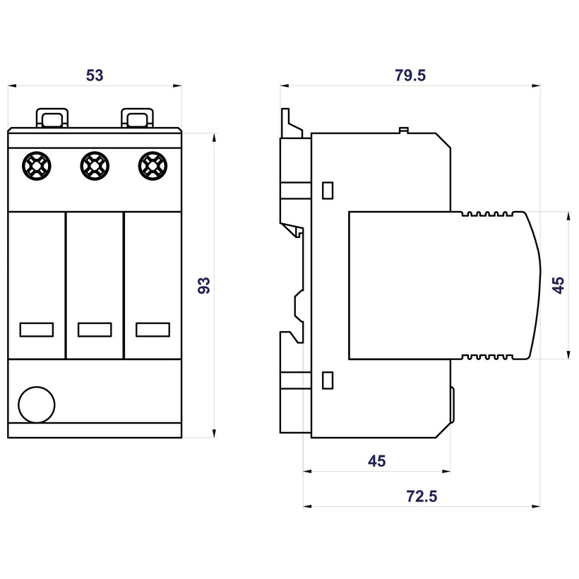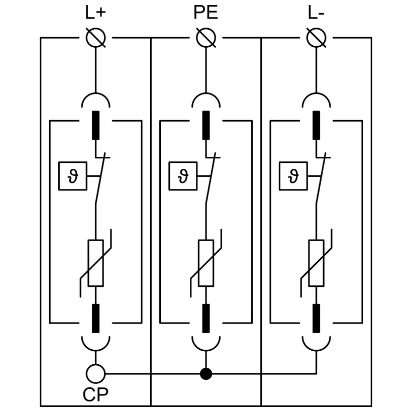 Cada sector de varistores entre L+, L– y PE está equipado con un desconcertador térmico interno. En Varistor Fin de vida (sobrecalentamiento), el desconcertador se dispara para interrumpir la corriente de DC y proporcionar una indicación clara de fallas. La construcción especial del desconcierto permite la instalación sin un fusible de respaldo separado, simplificando la coordinación y el espacio de ahorro.